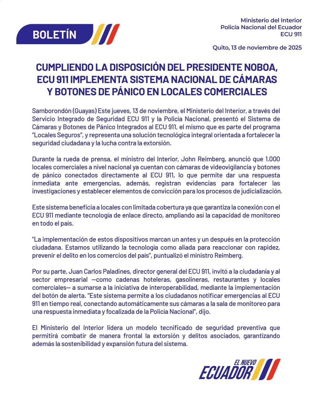 Durante una rueda de prensa realizada en Samborondón, el ministro del Interior, John Reimberg, destacó que ya son 1.000 los locales comerciales a nivel nacional que cuentan con cámaras de videovigilancia y botones de alerta conectados directamente al ECU 911. Esta implementación permitirá respuestas inmediatas en situaciones críticas y facilitará la recolección de evidencia para procesos judiciales.